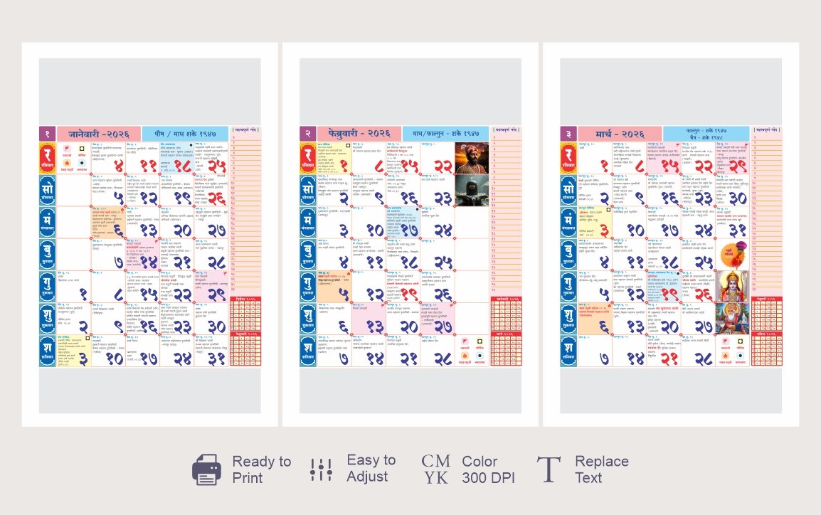 by customarts in Calendar 2025 , Calendar 2026 , CorelDraw , Templates on October 15, 2025Design your own 2026 Hindu Panchang Calendar effortlessly with our professional-quality CorelDraw (CDR) editable templates. Available in both Hindi and Marathi, these calendar design files are perfect for printing and customization. Each template is CMYK ready, ensuring sharp colors and a professional finish for commercial or personal projects.