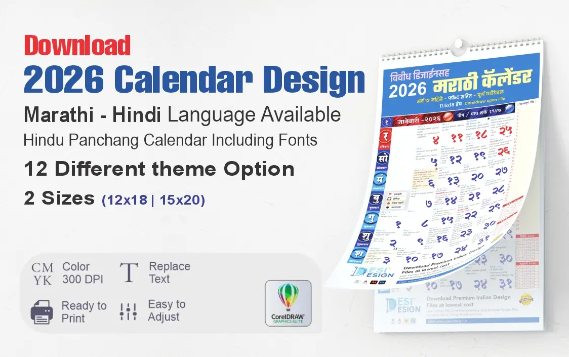 Calendar 2026 Home > Downloads > Calendar 2026 ALL PRODUCTS FORM Calendar 2026 Popular Recent Older Price (Low to High) Price (High to Low) Title (A - Z) Title (Z - A) New View Details 2026 Editable Hindu Panchang Calendar Design in Hindi & Marathi – CorelDraw Files by customarts in Calendar 2026, CorelDraw, Templates No ratings yet 0 5 INR 750.00